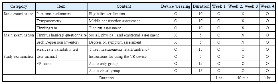 1주차 방문 시 시험 전 검사 실시 후 무작위 배정을 통해 참여 그룹을 정한 후 HMD 기기 착용 후 자연 사운드스케이프 체험을 진행하였다. 자연 사운드스케이프 체험을 하면서 체험 전과 후의 생리학적 변화를 보기 위해 체험 전 Samsung의 웨어러블 기기 착용 후 시험을 진행하였다. 심박수 측정의 경우 Samsung의 웨어러블 기기의 광학 센서를 사용하여 측정한다. 이 센서는 light emitting diode (LED; 발광 다이오드)를 통해 피부 아래 혈관에서의 혈액 흐름 변화를 감지한다. 심장이 박동할 때마다 혈액이 혈관을 통해 흐르며 이로 인해 피부의 색깔이 변화되는데, 이러한 피부 색깔의 변화를 광학 센서를 통해 측정하여 심박수를 계산한다. 혈압 측정의 경우, 일반적인 수동 혈압계에서 사용되는 원리와 유사한 알고리즘을 사용하는데 주로 심박수를 기반으로 혈압을 간접적으로 추정하는 방식이다. Samsung의 웨어러블 기기는 기계 학습 알고리즘을 통해 심박수와 관련된 데이터로부터 혈압을 예측하여 계산한다. 2, 3주차는 1주차 시험 과정과 동일하게 진행되었고, 4주차에는 기존 시험 방식과 동일하게 진행 후 실험 전후의 이명 회복 효과를 보기 위해 Table 1과 같이 검사를 진행하였다. 본 연구의 모든 참가자는 follow-up시 이명 증상이 사라진 사례는 없었으며 이는 연구 기간 동안 모든 대상자가 이명을 경험하였다. 다만, 참가자들의 이명 강도는 유의미하게 감소하는 경향을 보였으며 연구는 예정대로 4주차까지 진행되었다.