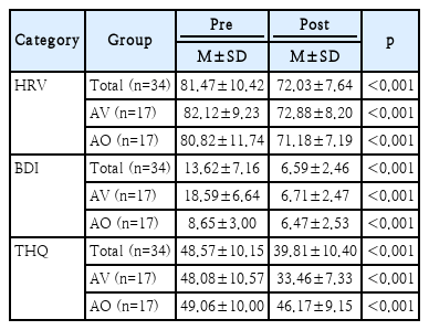 통계 분석은 SPSS Statistics (IBM Corp.) 소프트웨어를 이용하여 결과를 분석하였다. AO군과 AV군에 속한 연구 대상자들의 heart rate variability (HRV), BDI, THQ 지표가 실험 실행하기 사전과 사후에 따라 어떻게 다르게 나타났는지 확인하기 위해 변인별 기술 통계 결과를 도출하고, 사전과 사후에 따른 평균의 통계적 차이를 대응표본 t검정(paired sample t-test)을 통해 측정하였고, 그 결과는 Table 2와 같다.