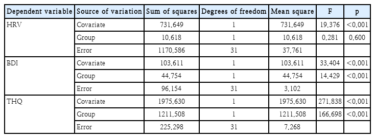 HRV의 경우, AV군과 AO군 간의 사후검사 점수의 차이가 유의미한지를 알아보기 위해 사전검사 점수를 공변인으로 하여 분석한 결과 유의미한 차이가 나타나지 않았다(SS=10.618, F=0.281, p>0.05). 이는 실험 이후 AV군과 AO군의 HRV 변화 간에 통계적으로 유의미한 차이가 없음을 보여준다. BDI의 경우, AV군과 AO군 간의 사후검사 점수의 차이가 유의미한지를 알아보기 위해 사전검사 점수를 공변인으로 하여 분석한 결과 유의미한 차이가 나타났다(SS=44.754, F=14.429, p<0.001). 이는 실험 후 AV군의 BDI 변화가 AO군의 변화에 비해 통계적으로 유의미한 차이가 있음을 보여준다. AV군(M=4.97, SE=0.52)이 AO군(M=8.21, SE=0.52)보다 더 낮게 나타났다. THQ의 경우 AV군과 AO군 간의 사후검사 점수의 차이가 유의미한지를 알아보기 위해 사전검사 점수를 공변인으로 하여 분석한 결과 유의미한 차이가 나타났다(SS=1211.508, F=166.698, p<0.001). 이는 실험 이후 AV군의 THQ 변화가 AO군의 변화에 비해 통계적으로 유의미한 차이가 있음을 보여준다. AV군(M=33.84, SE=0.65)이 AO군(M=45.79, SE=0.65)보다 더 낮게 나타났다.