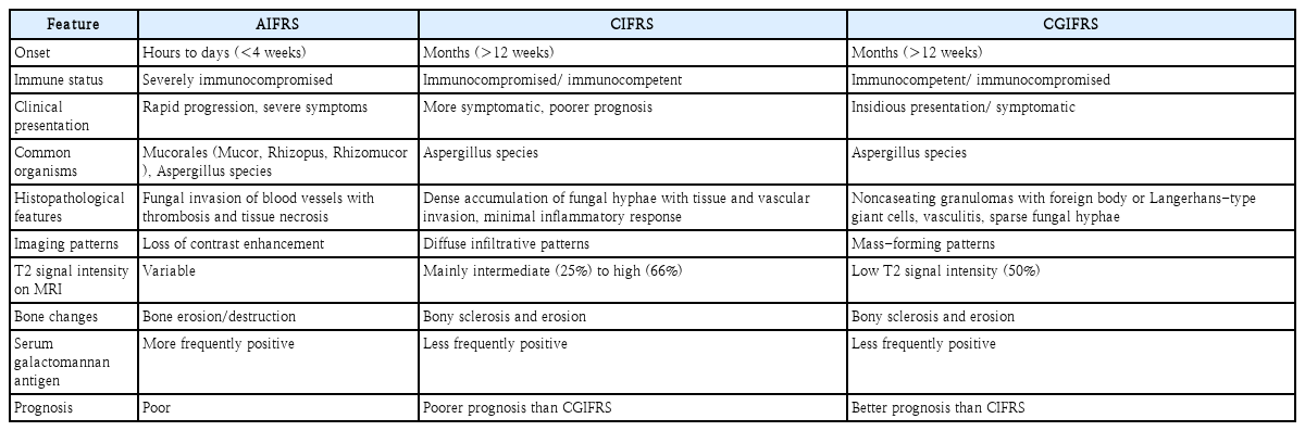 CIFRS presents with symptoms lasting more than 12 weeks and is characterized by a dense accumulation of fungal hyphae with tissue and vascular invasion, leading to necrosis but minimal inflammatory response. CGIFRS, on the other hand, shows noncaseating granulomas with foreign body or Langerhans-type giant cells, vasculitis, and sparse fungal hyphae [1,2]. CIFRS is generally more symptomatic and is associated with a poorer prognosis, occurring primarily in immunocompromised patients, whereas CGIFRS is likely to present more insidiously in immunocompetent patients [8-11].