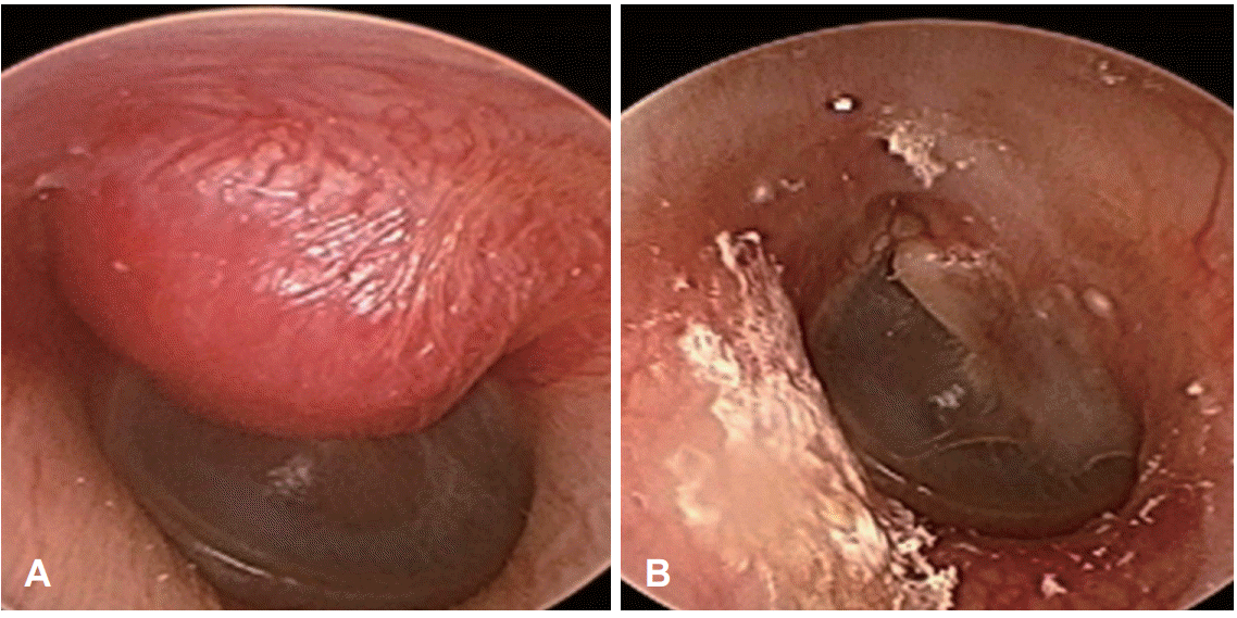 The photographs of preoperative (A) and postoperative (B) otoscopic findings. Preoperative otoscopic finding of the left ear shows a pinkish to reddish colored mass in the external auditory canal (EAC) (A). Postoperative otoscopic finding of ear shows a normal tympanic membrane and EAC (B).
