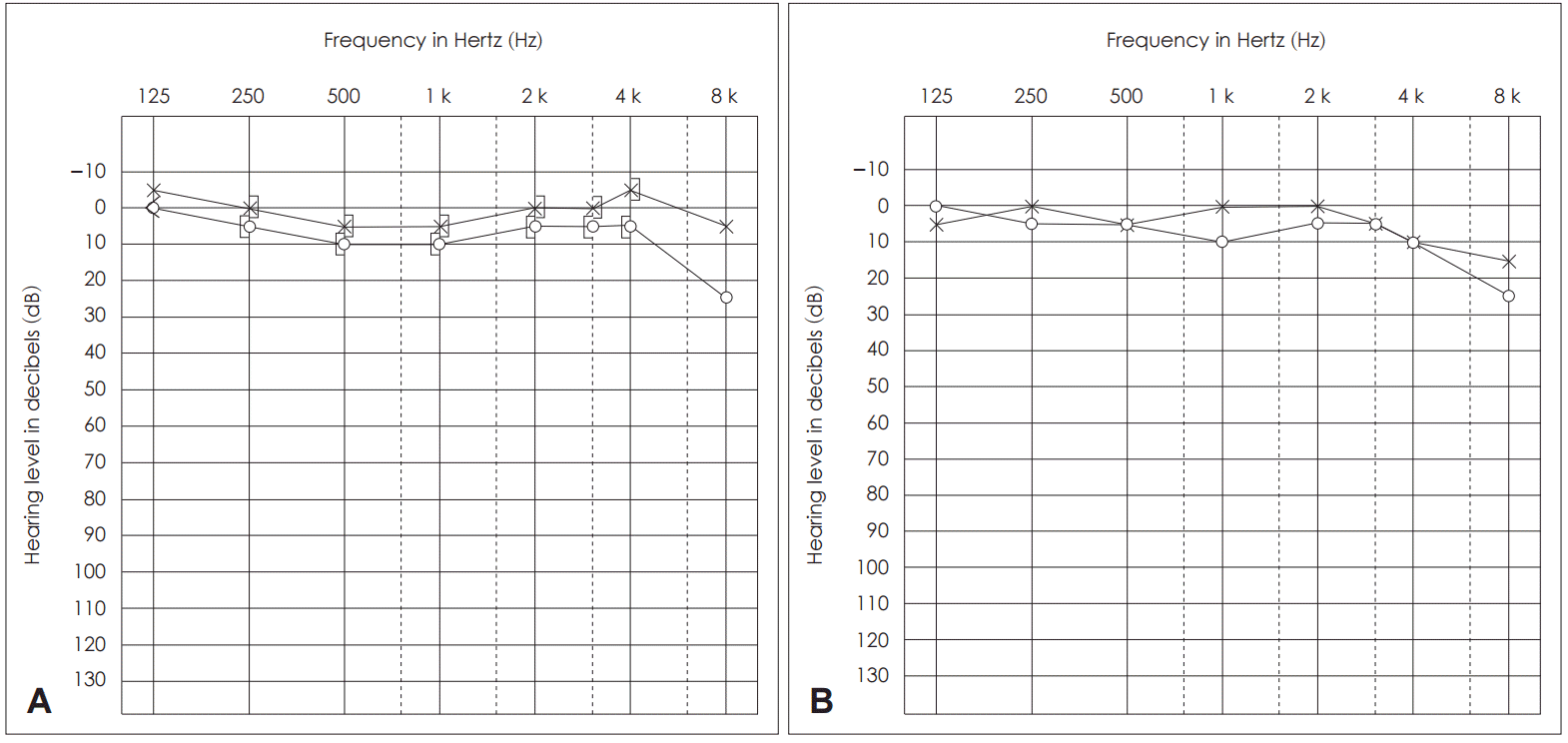 내원 당일 시행한 순음청력검사(4분법)상 좌측 기도 청력은 5 dB, 어음명료도는 100%로 정상 청력을 보였고(Fig. 2A) 이명검사에서는 “샥샥” 하는 초침소리와 같은 기계음이 들린다고 했으며 순음, 백색 잡음, 어음 잡음을 들려주었으나 비슷한 소리는 없다고 하였다. 종물을 감별하기 위해 측두골 전산화단층촬영 및 자기공명영상촬영을 시행하였다.