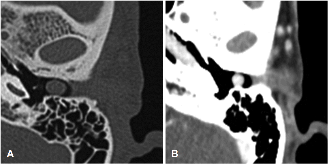 45세 남자 환자가 4개월 전부터 하루 종일 심장박동과 같이 뛰는 듯하게 지속되는 좌측의 박동성 이명을 주소로 내원하였다. 환자는 좌측 박동성 이명 이외의 청력저하, 이통, 이루, 현훈, 안면마비 등의 소견은 보이지 않았다. 특별한 기저질환은 없었으며 가족력 및 과거력상에서도 특이병력은 없었다. 외이도와 고막의 이경검사에서 좌측 외이도 후상방에 표면이 매끄럽고 경계가 명확한 적색의 종물이 관찰되었고 고막은 종물로 인해 반 정도 가려져 있었다(Fig. 1A).