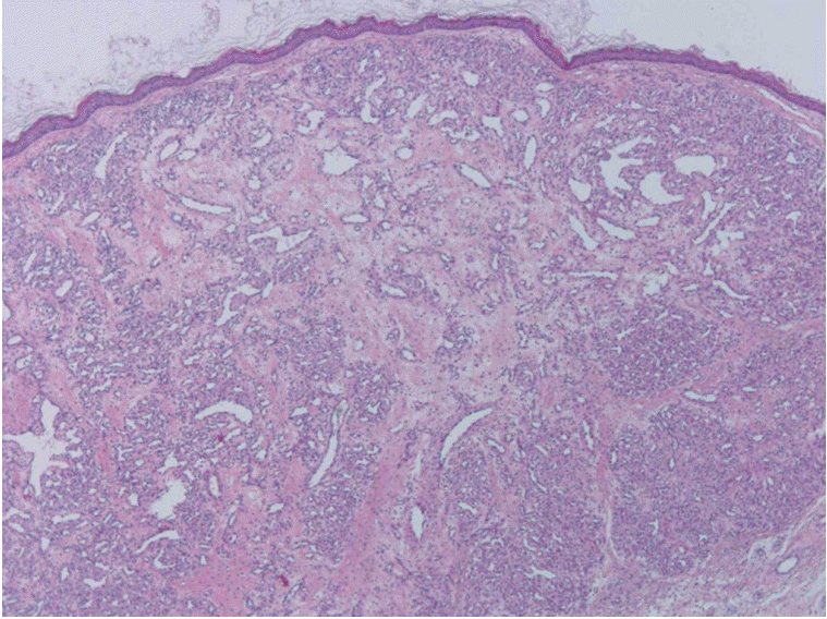 제거한 종물의 크기는 0.8×0.6×0.4 cm 크기로 병리조직학으로 모세혈관들의 소엽성 증식이 관찰되어 모세상혈관종으로 진단되었다(Fig. 4).