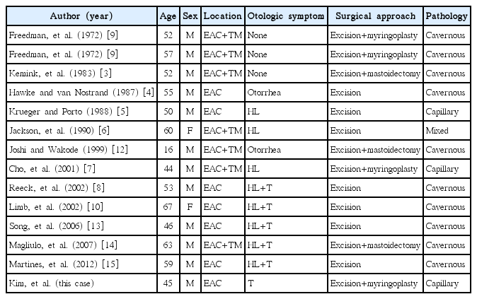 혈관종의 위치가 고막을 포함한 외이도 또는 외이도로 보고된 바로는 1972년 Freedman 등[9]에 의해 처음으로 보고되었으며 외이도의 혈관종을 조직학적으로 나누어 보았을 때 모세상혈관종은 1988년 Krueger와 Porto [5]에 의해 보고되었으며 국내에서는 1예[7]가 보고되었을 정도로 드물게 나타난다(Table 1).