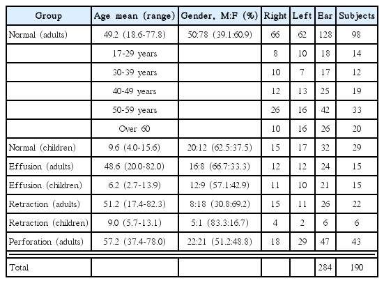 총 190명의 환자에서 284귀를 검사하였다. 광대역 고막 흡수도 검사에 사용된 기계에 설정되어 있는 소아 연령 기준과 동일하게 3~16세까지를 소아군으로 정하였는데, 이는 이전에 발표된 연구에 따라 정해진 기준이다. 소아 44명의 총 59귀에서 검사를 시행하였으며, 정상 32귀, 삼출성 중이염 21귀, 고막 함입 6귀가 포함되었다. 17세 이상 성인 146명에서는 정상 128귀, 삼출성 중이염 24귀, 고막 함입 26귀, 고막 천공 47귀를 검사하였다. 정상 성인의 경우에는 나이대별로 5개의 범주(17~29세, 30~39세, 40~49세, 50~59세, 60세 이상)로 구분하여 비교하였다(Table 1). 본 연구는 연구 시작 이전에 기관윤리심의위원회의 승인(IRB No. SMC 2014-12-022)을 받았다.
