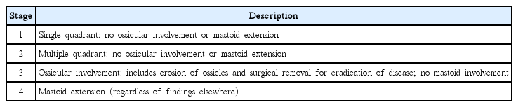 1999년 1월부터 2016년 3월까지 본원에 내원하여 Levenson 등[9]이 제시한 기준에 따라 선천성 진주종으로 진단받고 수술적 치료를 시행받은 68명의 환자들을 대상으로 하였으며, 의무기록 및 영상 자료를 통해 후향적으로 분석을 시행하였다. 본 연구는 본원의 임상시험윤리위원회(Institutional Review Board, IRB No. 2017-04-004) 심의를 승인받았다. 성별 및 연령, 진주종의 위치, McGill 등[10]이 제시한 기준을 근거로 개방형과 폐쇄형의 진주종 유형, Potsic 등[11]이 제시한 기준에 따른 병기(Table 1, Fig. 1), 수술 방법, 그리고 재발 여부 등에 대해 조사하였다.