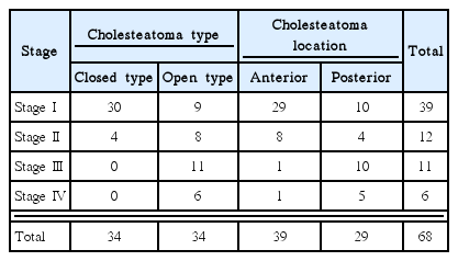 측두골의 함기화 정도는 함기형 59예, 경화형 2예, 기타 7예였다. 선천성 진주종을 위치와 유형 및 병기에 따라 분류하였을 때 추골병 전방에 위치한 경우가 40예, 후방에 위치한 경우가 28예였다. 폐쇄형 36예, 개방형 32예의 비율을 보였고, 병기별로는 병기 I 39예(57.3%), 병기 II 12예(17.6%), 병기 III 11예(16.2%), 그리고 병기 IV가 6예로 8.9%였다(Table 2).