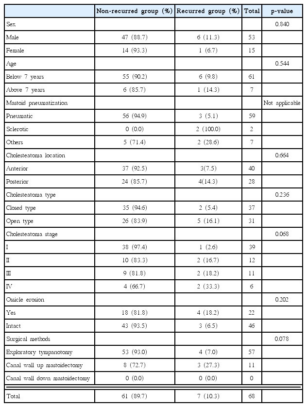 수술 당시 연령이 7세 이하에서 6예, 7세 초과에서 1예 재발하였으며, 연령에 따른 유의한 차이 또한 보이지 않았다(p=0.544). 남자 53명에서 6명(11.3%)에서 여자 15명 중 1명(6.6%)에서 재발하였으며, 성별에 따른 유의한 차이 또한 보이지 않았다(p=0.840). 측두골의 함기화 정도에서 함기형에서 5.1%, 경화형에서 100% 재발하였다. 진주종의 위치에 따라서 재발률에 유의한 차이는 없었으며(p=0.664), 진주종의 유형을 개방형과 폐쇄형으로 나누어 비교 시 폐쇄형에서 5.4%, 개방형에서 16.1% 재발하였다(p=0.236). 병기별로는 병기 I의 경우 2.5%, 병기 II 14.2%, III와 IV의 경우에도 15.4%와 25%로 병기가 증가함에 따라 재발률이 높아지는 소견을 보였으나 통계적으로는 유의한 차이를 보이지 않았다(p=0.068). 수술 소견상 이소골 파괴 유무에 따라 이소골의 파괴가 있었던 경우 18.2%에서, 파괴가 없었던 경우 6.5%에서 재발 소견을 보였다(p=0.202). 수술 접근 방법에 따라서 재발률에 차이는 없었다(p=0.078)(Table 3).