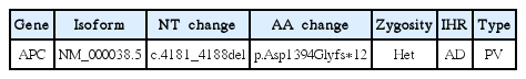 CMV-PTC는 가족성 선종성 용종증이 동반되는 경우가 많기 때문에, 병력 청취 및 유전자 분석을 시행하였다. 환자의 아버지가 대장의 용종증이 있었고, 대장암으로 10년 전 사망한 가족력이 있었다. 이에 위 및 대장 내시경검사와 APC 유전자 분석을 시행하였다. 위 내시경검사상, 위저 용종(stomach fundic polyp) 및 대장 내시경검사상 소장에서 1개, 대장에서 15개의 선종이 관찰되었다. APC 유전자에 대한 염기서열 분석 결과, 5번 염색체 q arm의 21번 유전자 4181~4188번째 염기서열이 결손(deletion)되어 1394번째 아미노산인 아스파트산(Aspartic acid)이 글리신(Glycine)으로 치환되면서, 조기 종결(premature termination)되는 프레임시프트 돌연변이(frameshift mutation)가 관찰되었다(Table 1, Fig. 4). 이 돌연변이는 이전에 보고된 적 없는 새로운 서열 변화이다[6].