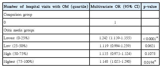 2003년 1년간 중이염으로 진료받은 횟수를 4분위로 나누어 그룹을 정하고 연령, 성별, 가계 소득 및 거주 지역, 아토피 질환 등 다른 인자를 보정한 이후 천식 진단의 연관성을 살펴보았다. 중이염이 없었던 대조군에 비해 네 그룹 모두 천식의 발생은 많았으나 최하위(p<0.001), 최상위 그룹(p=0.0194)만 통계학적 의미가 있었고 다른 그룹은 대조군과 통계학적 차이를 보이지 않았다(Table 3). 하지만 1년간 중이염 진료 횟수가 많아질수록 이후 천식의 발생이 늘어나는 양상은 보이지 않았다. 중이염을 주상병명으로 입원했던 그룹에서 외래 진료만을 받았던 그룹보다 천식의 발생이 57.1% 높은 것으로 나타났다(Table 4).