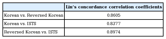 Statistical analysis of the collected data was performed using SPSS version 15 (SPSS Inc., Chicago, IL, USA). To examine the effects of different types of speech signals on ANLs, analysis of variance (ANOVA) with repeated measures was conducted (alpha levels <0.05 were considered statistically significant). We used Bland-Altman plots to assess the degree of agreement between any pair of the three methods with respect to the measurements of the different ANL examined. Lin’s concordance-correlation coefficient was used to evaluate the correlation between pairs of conditions (Korean vs. reversed Korean, Korean vs. ISTS, and reversed Korean and ISTS) [13].