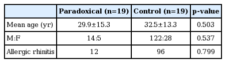 최종적으로 포함된 169명 중 19명(11.2%)에서 역설적 비폐색을 호소하였고, 평균 추적관찰 기간은 7.1±8.5개월이었다. 역설적 비폐색군과 대조군 간의 평균 나이와 성비 그리고 알레르기 비염의 동반 비율은 차이가 없었다(Table 1).