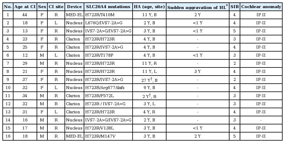 Clinical characteristics of the patients are summarized in Table 1. The patients were fitted with a hearing aid at a mean age of 6.5 years (range: 2-27 years). Eleven of 16 patients (69%) used bilateral hearing aids. Two patients (patients 9 and 11) had used hearing aids for a short period of time but discontinued their use due to limited benefit. Only one patient (patient 7) used sign language and others communicated using the auditory modality with or without the aid of lip reading. All of the patients exhibited prelingual or perilingual onset of hearing loss of variable degree which had progressed. Seven of 16 patients (44%) experienced sudden aggravation of hearing loss which occurred within 3 years before CI. The mean value for SIR measured preoperatively was 3.5, ranging from 2-5 (Table 1).