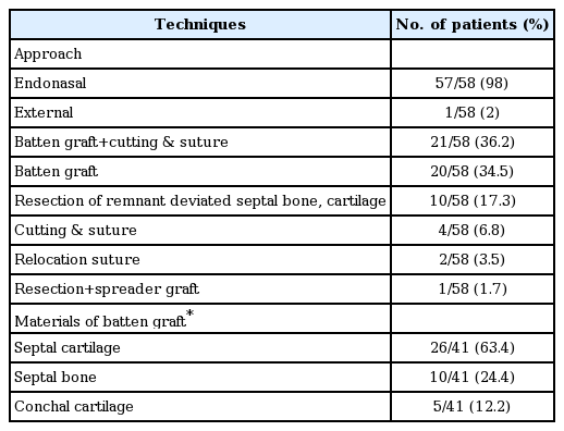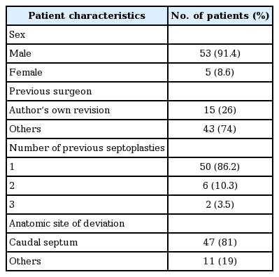 Baseline characteristics of the study patients are summarized in Table 1. Of the 58 patients, 15 (26%) were revision cases of an author of this study (Y.J.J.) and 43 (74%) were cases of other surgeons. Fifty cases (86.2%) were first revision cases, six (10.3%) were second revision, and two (3.5%) were third revision. Based on preoperative endoscopic examinations, 47 patients (81%) had a caudal septal deviation. The other sites of the deviation were mid-part cartilaginous septum in 8 (14%), bony septum in 2 (3.4%) and dorsal septum in 1 (1.6%). Whereas 57 patients underwent revision septoplasty via the endonasal approach, one patient who had a combined large septal perforation underwent revision septoplasty and perforation repair via the external approach.