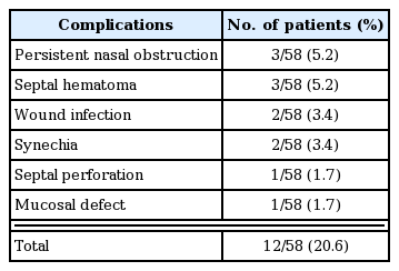 Complications after surgery included persistent nasal obstruction in 3 patients, septal hematoma in 3 patients, wound infection in 2 patients, synechia in 2 patients, septal perforation in 1 patient, and mucosal defect in 1 patient (Table 3). Among the 58 patients, additional surgical procedures were performed during the follow-up period in 3 patients. One patient who had persistent nasal obstruction underwent radiofrequency turbinate volume reduction and another patient who had a mucosal defect after revision septoplasty underwent a skin graft with postauricular skin under local anesthesia. One patient underwent open rhinoplasty for personal aesthetic requirements. No patient required revision septoplasty due to persistent or recurrent septal deviation during the follow-up period.