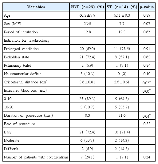 총 43명의 환자가 등록되었으며, 관혈적 기관 절개술은 14명, 경피적 확장 기관 절개술은 29명에서 시행되었다. 경피적 확장 기관 절개술을 받은 29명의 환자 중 초기 15명은 유도 없이 기관 천자를 시행하였고, 후기 14명은 굴곡형 후두경 유도 하에 기관 천자를 시행하였다. 평균 연령은 60.9±8.0세(35~79세)였고, 남성 30명(69.8%) 여성 13명(30.2%)이었으며, 두 군 간에 나이, 성별의 차이는 없었다. 평균 기관 삽관 기간은 평균 12.7일로 두 군 간의 차이는 없었으며, 시술 적응증으로는 지속적인 기계환기, 지속적인 병상상태(bedridden state), 효과적인 호흡기 분비물 제거(pulmonary toilet), 근-신경계 결핍(neuromuscular deficit)의 순서를 보였으며 여러 적응증이 혼재된 환자가 많았다. 삽관 기간 및 시술 적응증 역시 두 군 간에 유의한 차이는 없었다. 윤상-흉골 거리의 경우 경피적 확장 기관 절개술이 평균 3.6 cm로 관혈적 기관 절개술의 2 .6 cm에 비해 통계적으로 유의하게 길었다. 출혈량은 경피적 확장 기관 절개술의 경우가 관혈적 기관 절개술에 비해 적은 경향을 보였으며, 시술 시간은 경피적 확장 기관 절개술이 평균 8.0분으로 관혈적 기관 절개술의 21.6분에 비해 유의하게 짧았다. 술자가 판단한 시술의 난이도는 두 시술 방법 간에 차이는 없었으며, 시술 후 합병증 발생빈도는 경피적 확장 기관 절개술을 시행 받은 환자에서 높은 경향(24.1% vs. 7.1%)을 보였지만 통계적으로 유의하지는 않았다(Table 1).