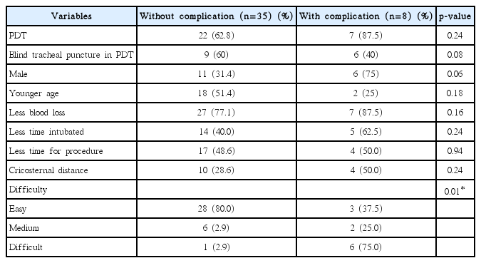 합병증의 예측인자를 분석해 보면 시술방법 및 관혈적 기관 절개술에서 기관 천자 방법은 합병증의 발생과 유의한 상관관계를 보이지 않았다. 환자의 성별과 나이, 출혈량, 기관 삽관 기간, 시술 시간, 해부학적 인자(윤상-흉골 거리) 등의 인자 역시 합병증 발생과는 연관이 없었다. 시술의 난이도와 합병증 발생률 간에는 유의한 상관관계가 있어, 술자가 시술이 어렵다고 느끼는 경우 합병증 발생률이 높아짐을 알 수 있다(Table 3).