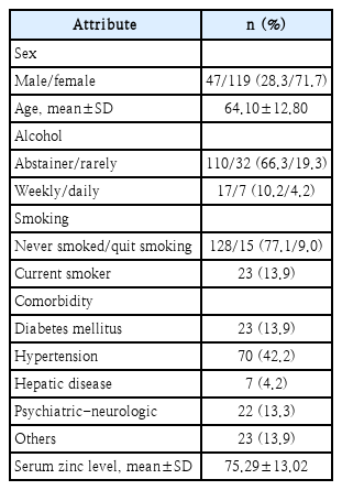 연구에 포함된 환자 중 119명(71.69%)이 여성, 47명이 남성이었으며, 평균 연령은 64.1세였다. 음주를 하지 않거나, 거의 하지 않는 환자는 142명이었으며, 담배를 피우지 않는 환자는 143명이었다. 동반된 질환은 고혈압이 70명에서 동반되어 가장 흔하게 동반된 질환으로 확인되었으며, 당뇨는 23명에서 동반되었으며, 우울증 및 불면증 등의 정신질환은 22명에서 동반되었다. 아무런 질환도 동반되지 않은 환자는 64명이었다(Table 1).