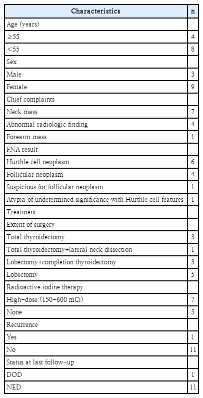 휘틀세포암 환자의 평균 연령은 50.8(36~71)세, 남녀 비는 3:9였다. 주 증상은 경부 종괴인 경우 7예(58.3%), 영상학적 검사상 우연히 발견된 경우 4예(33.3%), 절제 생검을 통해 확인한 원격 전이(전완부 종괴)의 경우 1예(8.3%)였다. 수술 전 세침흡인검사 결과는 휘틀세포 종양 6예(50%), 여포상 종양 4예(33.3%), 여포상 종양 의심 1예(8.3%), 휘틀세포 특성의 미확정 비정형 세포 1예(8.3%)였다. 처음부터 갑상선 전 절제술을 시행한 경우는 4예(33.3%)였고, 그 중 1예(8.3%)에서는 측경부 청소술을 같이 시행하였다. 엽 절제술 후 완결 절제술을 시행한 경우는 3예(25%)였다. 엽 절제술만 시행한 경우는 5예(41.7%)였다. 수술 전 세침흡인검사 결과가 대부분 휘틀세포 종양 혹은 여포상 종양이어서 진단적 수술을 시행한 것이기에 중심 경부 청소술은 시행하지 않았고, 첫 진단 시 측경부 림프절 전이가 있었던 1예에서만 경부 청소술을 시행하였다. 완결 절제술을 시행한 경우를 포함하여 갑상선 전 절제술이 시행된 환자 7예(58.3%)에서 모두 방사성 요오드 치료(150~600 mCi)를 시행하였다(Tables 1 and 2).