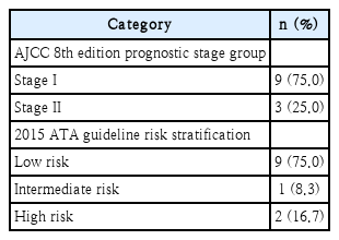 수술 후 병기(American Joint Committee on Cancer 8th edition)는 Stage I 9예(75.0%), Stage II 3예(25.0%)였으며, 미국 갑상선 협회 가이드라인(2015 American Thyroid Association Guideline, 2015 ATA Guideline)에 따른 위험도 분류시 저위험군 9예(75.0%), 중간위험군 1예(8.3%), 고위험군 2예(16.7%)였다(Table 4).