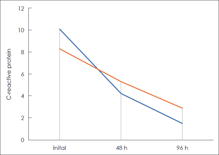 본 연구에서는 C-반응단백과 백혈구 수와 같은 혈액검사 수치를 비교하였다. 이는 기존의 연구에서는 다루지 않았던 지표로서, 환자가 스스로 보고하는 주관적 증상 점수를 뒷받침할 수 있는 객관적 근거가 될 수 있다. 본 연구에서는 치료 후 48시간째 시행한 검사 수치의 변화율을 구하였다. 백혈구 수 변화율은 48시간째 두 그룹 간에 유의한 차이를 보이지 않았다. C-반응단백은 스테로이드 사용한 그룹에서는 치료 후 48시간째 스테로이드 사용그룹은 53.3% 감소하였으며, 사용하지 않은 그룹은 23% 감소하여 스테로이드 사용 그룹에서 유의하게 C-반응단백이 큰 폭으로 호전된 것을 알 수 있었다(Fig. 1). C-반응단백은 급성기 반응물질 중 하나로 감염, 손상, 수술, 외상, 조직괴사 시 증가하며 손상받은 세포의 표면이나 세균 등의 표면에 침강반응을 일으키며 급성기 반응물질 중 가장 먼저 증가하고 치료 시 가장 먼저 정상화되는 특징을 가지고 있어 술후 치료 효과, 염증반응의 추적, 심부 감염이나 포도상구균 균혈증의 조기 발견의 예측 인자로도 사용된다[15]. 편도주위농양 퇴원을 결정에 있어서도, 편도 주위 부종의 감소와 삼킴곤란이나 압통감소 등의 이학적, 주관적 소견과 더불어 C-반응단백 호전은 중요한 지표가 되어왔으며, 스테로이드 그룹에서 빠른 C-반응단백 호전율은 입원 기간 단축에 관련된 것으로 보인다.