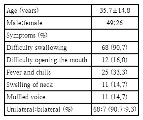 편도주위농양으로 입원 치료한 환자들의 특성을 Table 1에 정리하였다. 연구에 포함된 환자 수는 75명(mean age: 35.7±14.8, 남성 49명, 여성 26명)이다. 부가적 스테로이드를 사용한 그룹은 24명(mean age: 35.6±13.7, 남성 17명, 여성 7명), 스테로이드를 사용하지 않은 그룹은 51명(mean age: 36.6±16.9, 남성 32명, 여성 19명)이다. 두 그룹은 성별과 나이에서 통계적 차이를 보이지 않았다(p=0.492, 0.795). 입원한 환자들의 주 증상은 삼킴곤란이 90.7%로 가장 높았으며, 발열과 오한이 33.3%, 입벌림곤란이 16.0%로 확인되었다. 퇴원 시 환자의 삼킴곤란은 확연히 호전되었으며, 입벌림곤란도 모두 회복되었다. 입원 시 입벌림곤란을 호소한 환자는 스테로이드 사용군에서 4명, 사용하지 않은 군에서 8명으로 총 12명이었으며, 치료 48시간 경과 후 스테로이드 사용군에서는 3명이 호전되고, 사용하지 않은 군에서는 4명이 호전된 상태로 두 군간에는 유의한 차이를 보이지 않았다(p=1.000)(Table 2).