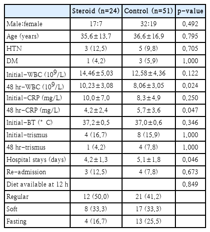 The length of hospital stay for the steroids group (n=24) and the no-use group (n=51) was 4.2±1.3 days and of 5.1±1.8 days (p=0.046), respectively, showing significantly shortened time for the steroids group. The rate of change in 48-hour C-reactive protein was 53.3% and 20% for the steroid group and no-use group (p=0.013), respectively. However, there was no differences between the two groups in the rate of change in body temperature at 12 hours of treatment, the diet available at 12 hours, and rate of change in the number of white blood cells after 48 hours of treatment.