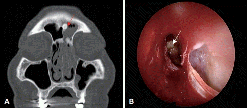 3개월 이상 내과적 치료에도 호전되지 않는 후비루와 후각저하로 64세 남자가 내원하였다. 부비동 내시경 수술을 계획하고 수술 전 시행한 CT의 coronal view(A), 수술 중 시행한 70도 비내시경의 좌측 비강 소견(B)이다. 화살표로 가르키는 소견과 관련된 내용으로 맞는 것은?