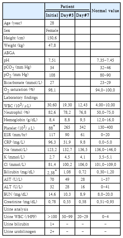 The initial definition of sepsis was developed at a 1992 consensus conference and was based on the systemic inflammatory response syndrome (SIRS) [9]. SIRS must fulfil at least two of the following four criteria: body temperature >38°C or <36°C, heart rate >90 beats/min, respiratory rate >20/min or a PaCO2 <32 mm Hg, and a WBC count >12000/mm3 or <4000 /mm3. Sepsis requires both a confirmed or suspected infection and SIRS. However, this initial definition did not explain the pathophysiology of sepsis, and was inadequately sensitive and specific. Many revisions have since been attempted. The most recent sepsis criteria were published as ‘Sepsis-3,’ a consensus guideline published by the European Society of Intensive Care Medicine and the Society of Critical Care Medicine in 2016 [8]. This guideline defines sepsis based on the sequential organ failure assessment (SOFA) score (a conventional score predicting the prognosis of critically ill patients); specifically as an increase of ≥2 points [10]. In our patient, fever and increased WBC count were no longer included in the diagnostic criteria and her blood pressure did not meet the criterion, in contrast to the initial definition. However, the abnormal bilirubin and platelet data were worth 4 points on the SOFA score and a pathogen was clearly identified, so sepsis could be diagnosed.