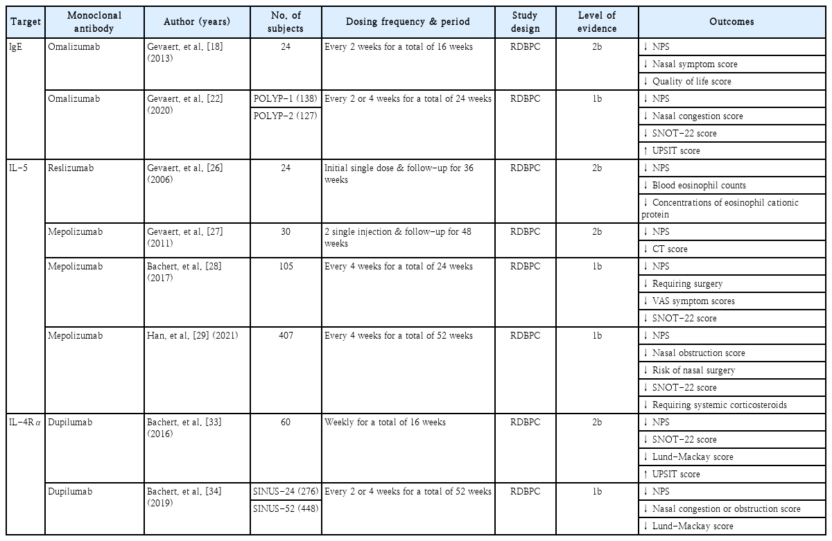 생물학적 제제는 천식이나 아토피 피부염 등과 같은 다양한 알레르기-매개 질환에 대한 혁신적인 치료법으로 사용되어 지난 15년 동안 고무적인 결과를 보였고[7], CRSwNP의 병태생리는 천식의 병태생리와 겹치는 부분이 많다. 두 질환의 병태생리가 모두 제2형 염증반응 및 호산구 침윤이라는 부분이 공통점이며, 최근 수년간 CRSwNP에 대하여 개발되고 있는 여러 생물학적 제제는 제2형 염증반응을 억제하는 역할을 한다[17-19]. 현재 호산구성 CRSwNP에 대한 여러 단일클론항체가 연구 중이며, 조절되지 않는 CRSwNP에서 치료 효과를 보이고 있다(Table 1). 대표적으로 IL-4 receptor α에 대한 단일클론항체인 dupilumab은 치료 효과를 인정받아 2019년 6월에 미국 FDA의 승인을 받았으며, 조절되지 않는 성인 CRSwNP에서 사용할 수 있다. 이후 IgE를 표적으로 작용하는 단일클론항체인 omalizumab과 IL-5에 대한 단일클론항체인 mepolizumab도 성인 CRSwNP 환자를 치료하기 위한 보조요법으로 각각 2020년 12월과 2021년 7월에 미국 FDA의 승인을 받았다. 그 외 다른 단일클론항체들은 아직 FDA의 승인을 받지는 못하였으나 효능과 안전성에 대해 평가 중이다.