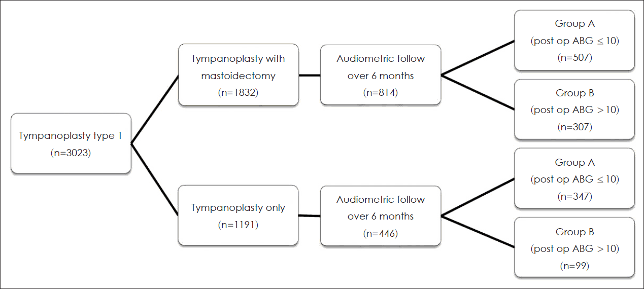1989년 5월부터 2018년 12월까지 강동성심병원 및 한림대학교성심병원에서 만성 중이염으로 1인 술자에 의해 제1형 고실성형술을 시행 받은 후 6개월 이상 청력결과 추적이 된 환자를 대상으로 후향적 연구를 실시하였다. 수술 대상군은, 이소골 미란을 동반하지 않는 단순 만성 중이염 혹은 일부 진주종성 중이염 환자군이 포함되었으며, 이소골 미란을 동반하여, 이소골 성형술을 동반한 환자군은 제외하였다. 각 예들에 대해 수술기록을 포함한 병원의무기록과 함께 2005년 대한이과학회에서 배포한 중이수술 데이터베이스에 저장되고 관리된 자료를 이용하여 후향적 분석을 시행하였다. 본 연구는 본원의 임상시험연구심사위원회(Institutional Review Board)의 검토와 승인을 얻은 후 진행하였다(HALLYM 2020-06-002-001).