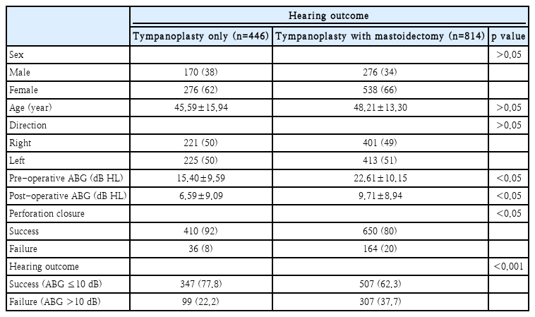 유돌절제술을 동반한 군과 그렇지 않은 군을 기준으로 비교하였을 때, 두 군 간의 성별, 나이, 수술귀의 방향에서는 유의한 차이를 보이지 않았다. 제1형 고실성형술만을 단독적으로 시행하였을 경우 수술 전, 후 기도-골도청력차는 각각 15.40±9.59 dB HL, 6.59±9.09 dB HL이었고, 유돌절제술을 동반한 경우는 각각 22.61±10.15 dB HL, 9.71±8.94 dB HL로 측정되어 유돌절제술을 동반하지 않은 경우 수술 전, 후 기도-골도차가 유의하게 낮았다(p<0.05). 이때, 술후 기도-골도차 청력의 개선정도는 유돌절제술 동반 군에서 유의하게 높게 나타났다. 수술 후 발생한 천공의 재발 여부를 보았을 때, 유돌절제술을 동반하지 않았을 경우, 술후 정상적인 고막 소견을 보인 예가 446예 중 36예(8%), 유돌절제술을 동반한 경우는 814예 중 164예(20%)로, 두 군 간의 차이를 카이 제곱검정을 통해 유의성을 검정하였고, 고막성형술만을 시행한 경우 천공의 재발 비율이 더 낮았다(p<0.05) (Table 1).