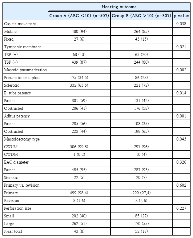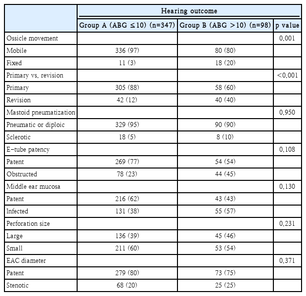 성공군(A)에서 실패군(B)에 비해 유동적인 이소골 움직임을 가진 환자 비율 및 초수술 환자의 비율이 높았으며, 그 외 유양동의 함기화, 이관기능, 중이 점막의 상태, 술전 천공의 크기 및 외이도의 협착 여부는 양 군 간 유의한 차이를 보이지 않았다(Table 3).