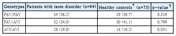 본 연구의 미각장애 환자의 유전자형의 분포와 비교하였을 때 미각장애 환자에서 정상인보다 PAV/PAV(환자 36.2%, 정상 39.7%; p=0.529) 및 PAV/AVI (환자 34.0%, 정상 41.1%; p=0.799)형이 통계적으로 유의하지는 않았지만 적고, AVI/AVI형은 통계적으로 유의하게 많은 것을 알 수 있었다(환자 29.8%, 정상 19.2%; p=0.031, by chi-square test) (Table 1).