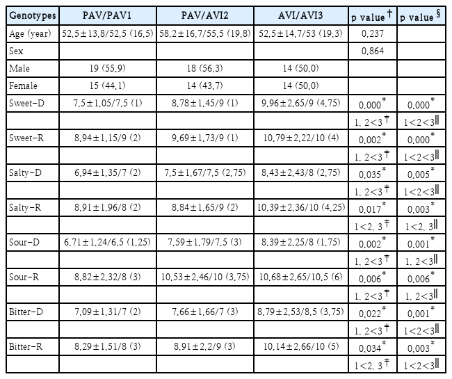 세 군 간의 차이 및 기본 맛별 차이를 보기 위해 통계 분석을 시행하였을 때 단맛 감지역치 및 인지역치, 짠맛 감지역치, 신맛 감지역치 및 인지역치, 쓴맛 감지역치는 PAV/PAV형과 PAV/AVI형이 동일하며 AVI/AVI형보다 통계적으로 유의하게 낮았다. 또한 짠맛 인지역치와 쓴맛 인지역치는 PAV/AVI형과 AVI/AVI형이 동일하며 PAV/PAV형보다 통계적으로 유의하게 높았다(Table 2).