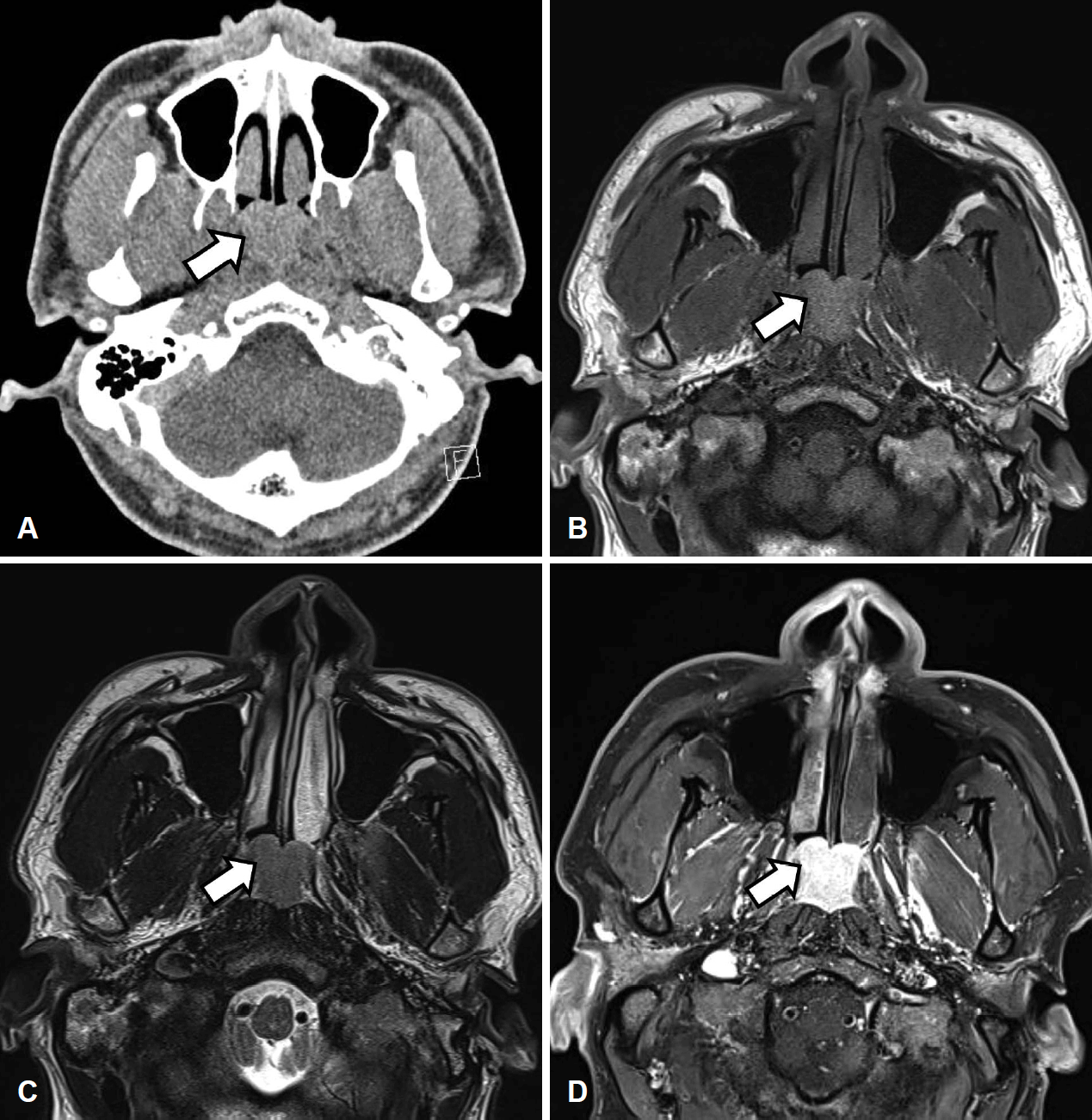 Preoperative imaging study of the nasopharyngeal lesion. A: Contrast-enhanced CT image shows about 2.5 cm enhancing mass (arrow). B: MRI T1 weighted image shows well-defined hyperintensity mass (arrow). C: MRI T2 weighted image shows well-defined mass with high-signal intensity (arrow). D: MRI T1-enhanced image shows homogenous enhancing mass (arrow).