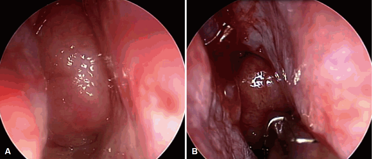45세 남자 환자가 내원 20년 전부터 시작된 양측 코막힘 주소로 내원하였다. 콧물 및 후비루는 없었으나 코골이, 구호흡, 수면 무호흡증을 호소하였다. 시행한 코 내시경 검사상 우측으로 편위된 비중격 소견 및 양측 후비공을 완전히 막고 있는 부드러운 표면을 가진 비인두 종물이 확인되었다. 조영증강 전산화단층촬영 영상에서는 좌측 접형동의 부비동염과 함께 조영 증강되는 약 2.5 cm의 비인두 종물이 확인되었다. 이후 시행한 조영 증강 자기공명영상에서는 비인두 종물이 T1, T2 강조영상에서 모두 고강도 신호로 나타났으며, 조영증강 시 균질하게 조영 증강되어 양성 림프구 증식증, 림프종, 악성 종양 등이 의심되었다(Fig. 1). 이에 부비동 내시경 수술, 비중격 교정술 및 비인두 종물 절제 수술을 계획하였다. 수술장 소견상 매끈하고 둥근 모양의 비인두 종물이 확인되어 내시경적 절제술을 시행하였고 수술 시 종물을 겸자로 잡으면 잘 부서지고 출혈이 잘 되는 소견이 있어 piece meal로 제거하여 지혈하였다(Fig. 2). 수술 과정에서의 특별한 합병증이나 수술 후 후유증 없이 잘 회복되어 퇴원하였다.