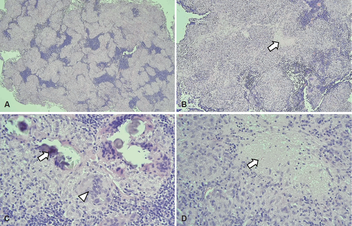 Histopathologic findings of the nasopharyngeal mass (hematoxylin and eosin stain). A: Plump granulomas were seen at ×40 magnification. B: Necrosis inside granulomas was seen at ×100 magnification (arrow). C: Microcalcification (arrow) and multinucleated giant cell (arrowhead) were seen at ×400 magnification. D: Granuloma mainly composed of epithelioid histiocytes and lymphocytes, and partial necrosis (arrow) were seen at ×400 magnification.
