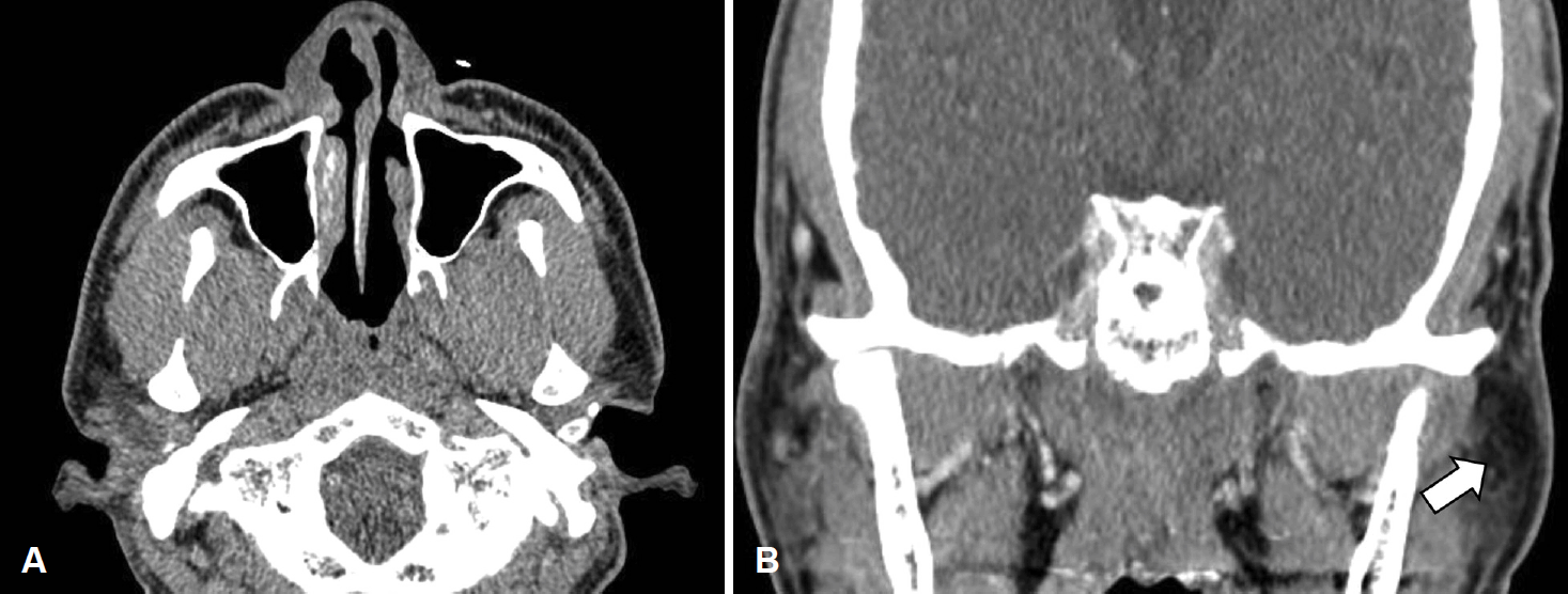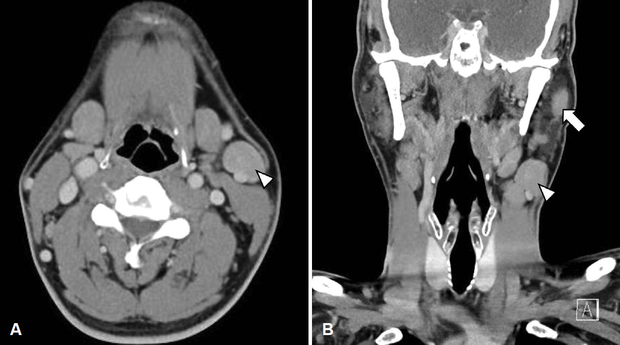 Neck CT findings 1 month after the operation. Axial (A) and coronal (B) image of neck CT showed multiple non-necrotic hypoattenuated lymphadenopathy in left intraparotid (arrow), both level 1b, 2 (arrowhead: left level 2), 3, and left level 5b.