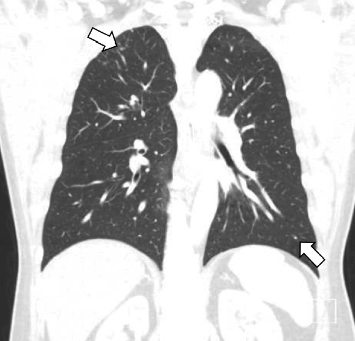 Chest CT scan findings. Equivocal ill-defined micronodular infiltration at right upper lobe apex and left lower lobe were found (arrows).