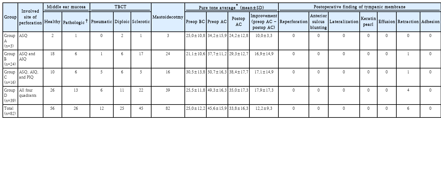 연구 대상 기준을 충족하여 연구에 포함된 환자는 78명(남자 31명, 여자 47명)이었고, 수술 귀로는 총 82귀(우측 44귀, 좌측 38귀)였다. 수술 당시 나이는 평균 51.5±14.7세였다. 고막 천공 위치에 따른 분류로는 A군이 3귀(4%), B군이 24귀(29%), C군이 16귀(19%), D군이 39귀(48%)였다. 평균 수술 시간은 99.2±20.0분이었고, 평균 입원 기간은 5.2±1.4일이었다. 예방적 항생제는 입원 중에는 정맥 주사로 투여하였고, 퇴원 후에는 2주간 경구로 투약하였다. 퇴원 후에는 이식편이 생착될 때까지 주 1회 외래 통원 치료를 시행하였다.