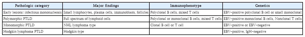 CAEBV는 면역저하질환이 없는 환자에서 말초 혈액의 EBV DNA의 상승을 보이며, 조직에서 EBV 양성 T cell의 침윤 소견이 확인되고, 6개월 이상의 이환 기간을 특징으로 하는 만성질환으로 정의된다[4,7,8]. 최근 연구에서는 더 급격한 진행을 보이는 사례가 있어 3개월을 이환기간으로 정의하기도 한다[2,7]. 본 증례는 면역저하질환은 없으나 hydrocortisone 5 mg을 수년간 복용한 기왕력이 있는 자로, 문헌에 따르면 매일 5 mg 이하 혹은 총 누적용량 700 mg 이하의 corticosteroid 복용은 감염위험을 증가시키지 않는 것으로 알려져 있으나[9], 스테로이드 복용력은 약물 용량에 비례한 세포매개 면역반응을 억제하여 EBV 감염에 더 취약하게 한다. 이러한 면역저하상태임을 고려할 때, 병리학적으로 post-transplant lymphoproliferative disease (PTLD)를 고려해 볼 수 있다(Table 1). 증례의 환자는 형태학적으로 그중 polymorphic PTLD로 분류 가능하며, 임상적으로는 위 진단기준을 만족하여 CAEBV에 합당하다고 할 수 있다.