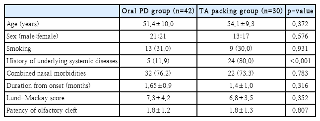 전체 대상 환자는 총 72명으로 TA 국소 요법을 시행받은 환자는 30명, 경구 PD 요법을 시행받은 환자는 42명이었다. 전체 대상 환자의 나이는 평균 52.8±13.2세이고, TA 국소 요법 군 54.1±9.3세, 경구 PD 요법 군 51.4±10.0세로 통계적으로 유의한 차이는 없었다(p=0.372). 전체의 성별은 남자 34명, 여자 38명이었고, 두 군 간에 유의한 성별 분포 차이는 없었다(p=0.576). 그 외에 처음 증상 발현 후 경과된 기간, 흡연자의 비율도 두 군 간의 유의한 차이는 없었다(p=0.316, 0.931). 동반된 비부비동 질환은 경구 PD 요법 군에서 알레르기 비염 19예, 만성 비부비동염 16예, 비용종 5예로 한 가지 이상의 비부비동 질환이 동반된 경우는 총 32예(76.2%)였고, TA 국소 요법 군에서는 알레르기 비염 13예, 만성 비부비동염 11예, 비용종 3예로 한 가지 이상의 비부비동 질환이 동반된 경우는 총 22예(73.3%)로 두 군 간의 유의한 차이는 없었다(p=0.783). 부비강 전산화단층촬영으로 평가한 치료 전 Lund-Mackay 점수는 경구 PD 요법 군이 평균 7.3±4.2점, TA 국소 요법 군이 평균 6.8±3.5점이었고, 후열 개존 정도는 경구 PD 요법 군이 평균 1.8±1.2점, TA 국소 요법 군이 평균 1.8±1.3점으로 모두 두 군 간의 유의한 차이는 없었다(p= 0.352, 0.807). 경구 PD 요법 군에서 과거력상 확인된 전신 질환은 고혈압 3예, 고지혈증 2예, 총 5예였고, TA 국소 용법 군에서는 당뇨병 20예, 소화성 궤양 4예, 총 24예로 단기간의 전신적 부신 피질 호르몬 사용 시에도 부작용 위험이 높은 전신 질환의 비율은 TA 국소 요법 군에서 유의하게 높았다 (p<0.001) (Table 1).