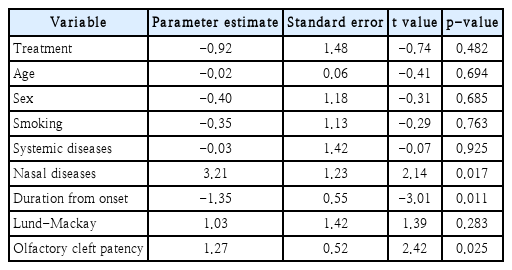 치료 후 TDI 점수가 호전되는 정도에 영향을 미치는 인자들과 부비동 전산화단층에서 확인되는 염증의 정도, 후열 개존 상태가 미치는 영향을 알아보기 위해 다중 선형 회귀분석을 시행한 결과, 동반된 비부비강 질환이 있는 경우, 증상 발현 후 치료 시작까지 경과 기간이 짧을수록, 그리고 치료 시작 전 부비강 전산화단층촬영상에서 후열의 폐쇄가 심할수록, 치료 후 TDI 점수의 회복 정도가 높았다(p=0.017, 0.011, 0.025/adjusted R2=0.416) (Table 2).