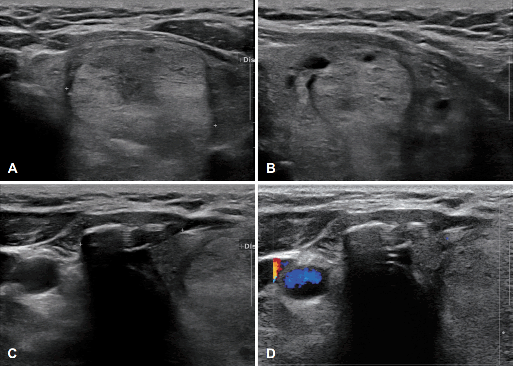 Preoperative ultrasound images. A and B: 30.8×28.7 mm sized well-defined heterogenous echoic nodule with microcalcification in left thyroid lobe. C and D: 20.7 mm sized ill-defined hypoechoic lesion with posterior acoustic shadowing in right level VI.