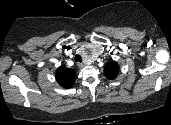 Axial view of contrast enhanced chest CT scan showed that about 6.5×4.5×5.5 cm sized ill-defined enhanced left thyroid mass and about 1.7 cm sized hyperattenuated lesion in right level VI (arrow).