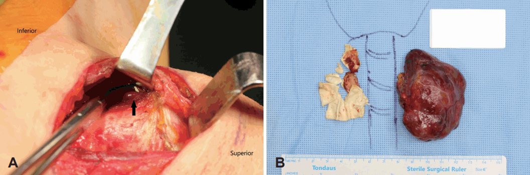 초음파 소견과 해당 부위의 자주 재발하는 통증, 혈액 검사상 보인 TSH 억제 소견과 결절의 크기가 증가하는 증상으로 제4 새열낭종 및 갑상선염을 동반한 갑상선암에 대한 감별을 필요로 하였으며, 환자의 수술적 치료에 대한 요구를 고려하에 좌측엽에 대한 완성형 갑상선절제술(completion thyroidectomy) 및 우측 6 구역(level VI) 부위 종물 제거술을 진행하였다. 전신마취하에 전경부의 과거 갑상선 수술 반흔을 따라 수평으로 피부를 절개하고 광경근(platysma muscle) 하 피부 피판 거상을 시행하였다. 우측 흉골설골근과 흉골갑상근을 외측으로 견인 후 조심스럽게 박리한 뒤, 과거 우측엽 절제술 부위에 초음파상 혼합성 음영의 병변으로 보이던 주변 조직과 심한 유착을 동반한 종괴성 병변을 발견하여 동결절편검사를 시행하였으나 인체조직이 아닌 이물소견이 보여 해당 병변을 완전 절제하였다. 종물은 피막에 둘러싸인 선홍색의 납작한 모양이었으며, 내부에 흰색 내용물을 포함하고 있었다. 이후 우측 종괴성 병변과 인접해있던 갑상선 좌엽을 제거하고 경부 공간 내 남은 이물이 없는 것을 확인 후 수술을 종료하였다. 양측의 반회후두신경 손상은 없었다. 제거된 우측 6구역의 조직 모양이 수술장갑과 유사함을 인지하여 병리과에 보고하였고 병리 보고상 인체 조직이 아닌 이물임을 확인하였다(Fig. 3). 병리조직 검사상 갑상선 좌측엽은 육아조직(granulation tissue)이 동반된 결절성 과증식(nodular hyperplasia)으로 보고되었다. 수술 후 후두경상 성대기능은 정상이었으며 환자는 합병증 없이 퇴원하였다. 수술 2개월 후 측정한 갑상선 호르몬 검사상 정상치로 조절되었으며, 저자들이 우려하였던 법적 분쟁 없이 내분비내과 에서 정기적으로 추적 관찰 중이다.