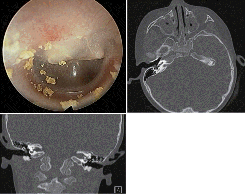 특이 과거력이 없는 2세 여아가 우측 고막의 흰색 종물 소견으로 내원하였다. 환아가 호소하는 특이 증상은 없었다. 다음은 외래에서 시행한 내시경 사진과 전산화단층촬영 사진이다. 이 질환에 대한 설명으로 맞지 않은 것을 고르시오.