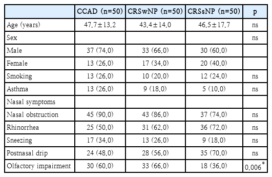 A total of 150 patients were included in this study (50 patients each in the CCAD, CRSwNP, and CRSsNP). Table 1 shows the demographic characteristics and initial nasal symptoms of patients. There were no significant differences in age, gender, smoking history and asthma among the three groups. As for the initial nasal symptoms, we determined whether the patients complained about the following 5 symptoms; nasal obstruction, rhinorrhea, sneezing, postnasal drip, and olfactory impairment. The most common nasal symptom was nasal obstruction in all study groups (90%, 86% and 74% respectively). Olfactory impairment was significantly more prevalent in the CCAD and CRSwNP than in the CRSsNP, and the other 4 nasal symptoms were not significantly different among three groups. Overall, CCAD and CRSwNP showed similar features of nasal symptoms.